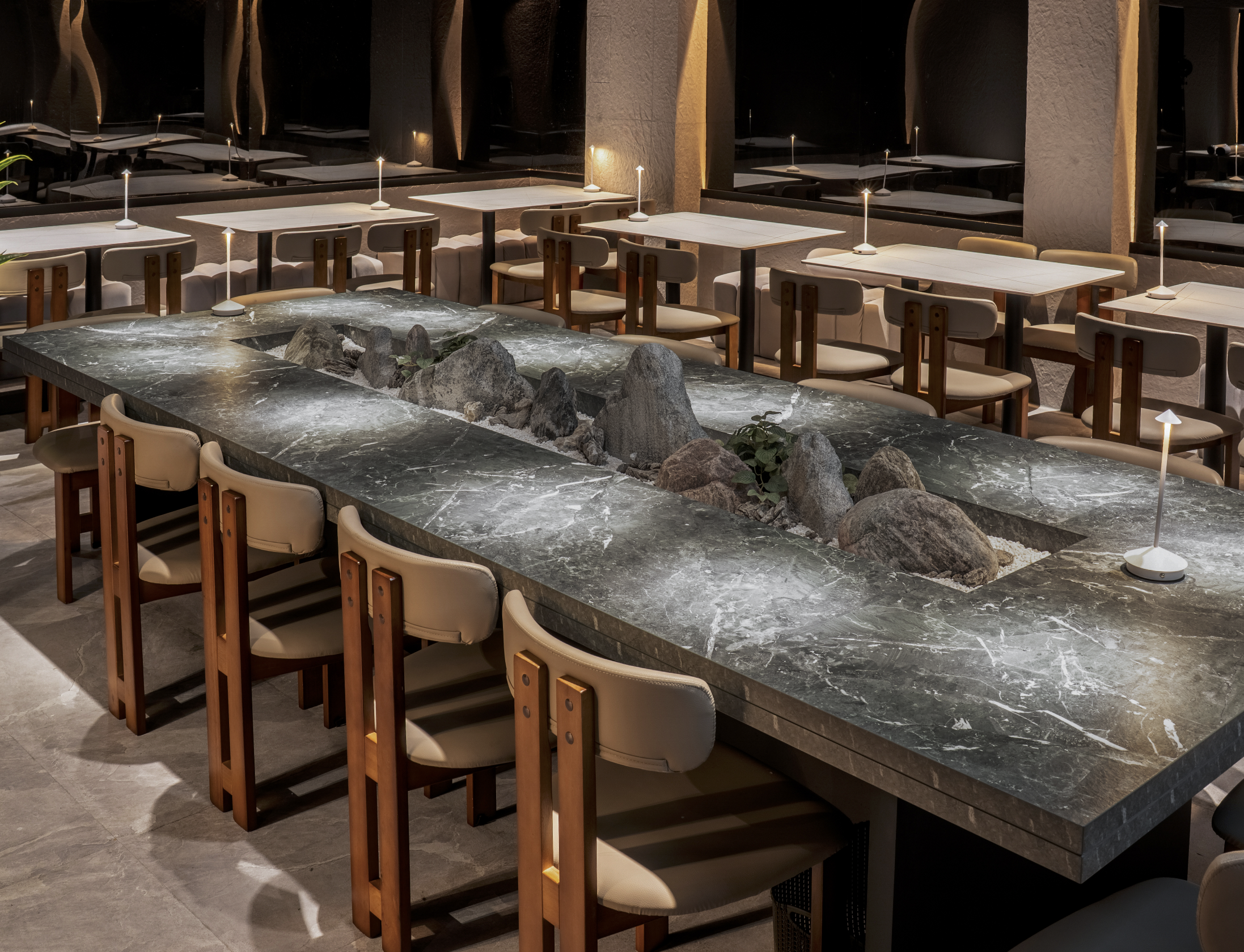 空間佈局延伸了品牌核心:洗練的線條搭配溫潤材質,鋪陳出兼具現代感與私密性的用餐語境。沉穩的暗色天花與精準的重點照明,將視覺感官聚焦於席間的盤飧與對話。空間軸心由一張融合大理石、天然原石與沙紋理的長桌定調,既是視覺端景,更是連結情感的社交載體。整體色調在韓式的感性與日式的精準間取得和諧平衡,展現出靜謐且從容的空間層次。